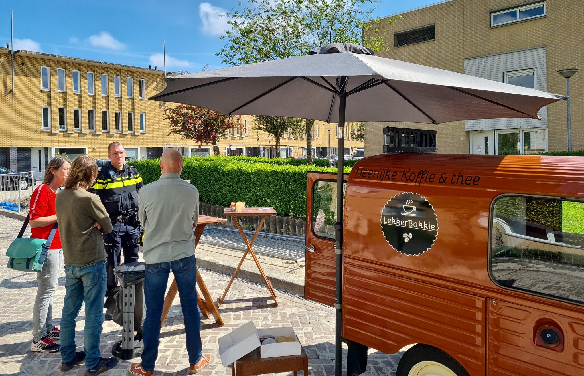 Om het gesprek aan te knopen werd gebruik gemaakt van een koffiekar. “Onder het genot van een kopje koffie, thee en koek zijn buurtbewoners met medewerkers van de gemeente, het WIJ-team, de woningbouw en wijkagenten in gesprek gegaan over een veilige straat”, meldt de politie. “We kunnen terugkijken op een leuke opkomst en goede gesprekken.”