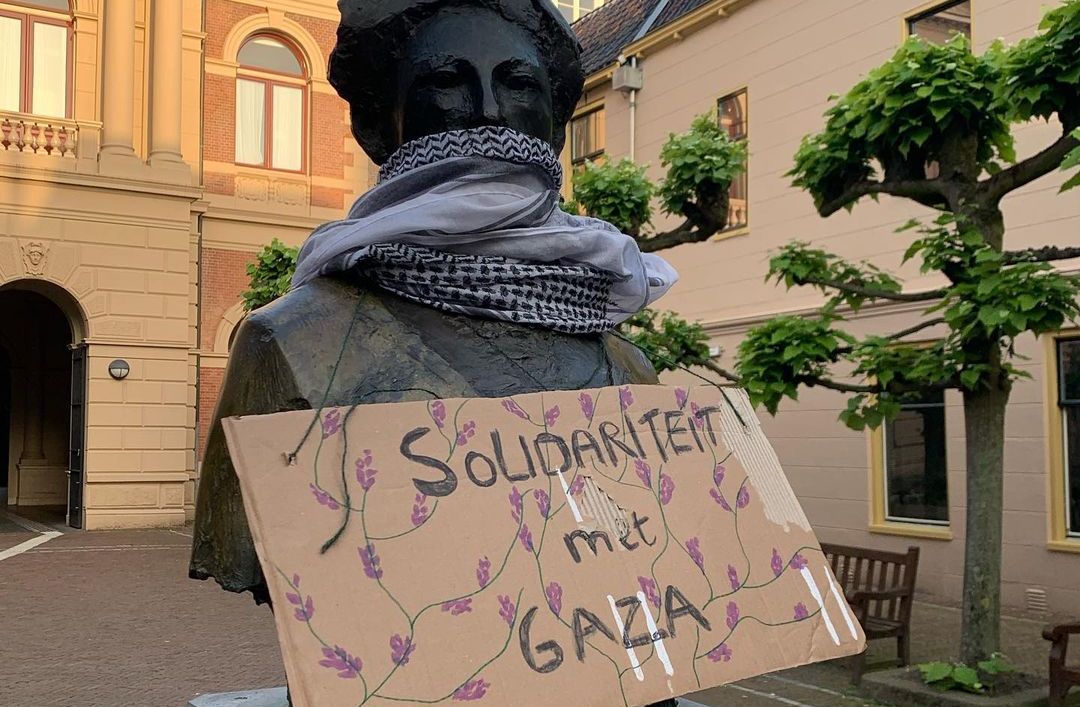 Bij een grote reeks standbeelden in Groningen verschenen vrijdag protestborden. Op de borden stonden leuzen vanuit Pro-Palestijnse hoek rond het conflict in Gaza.