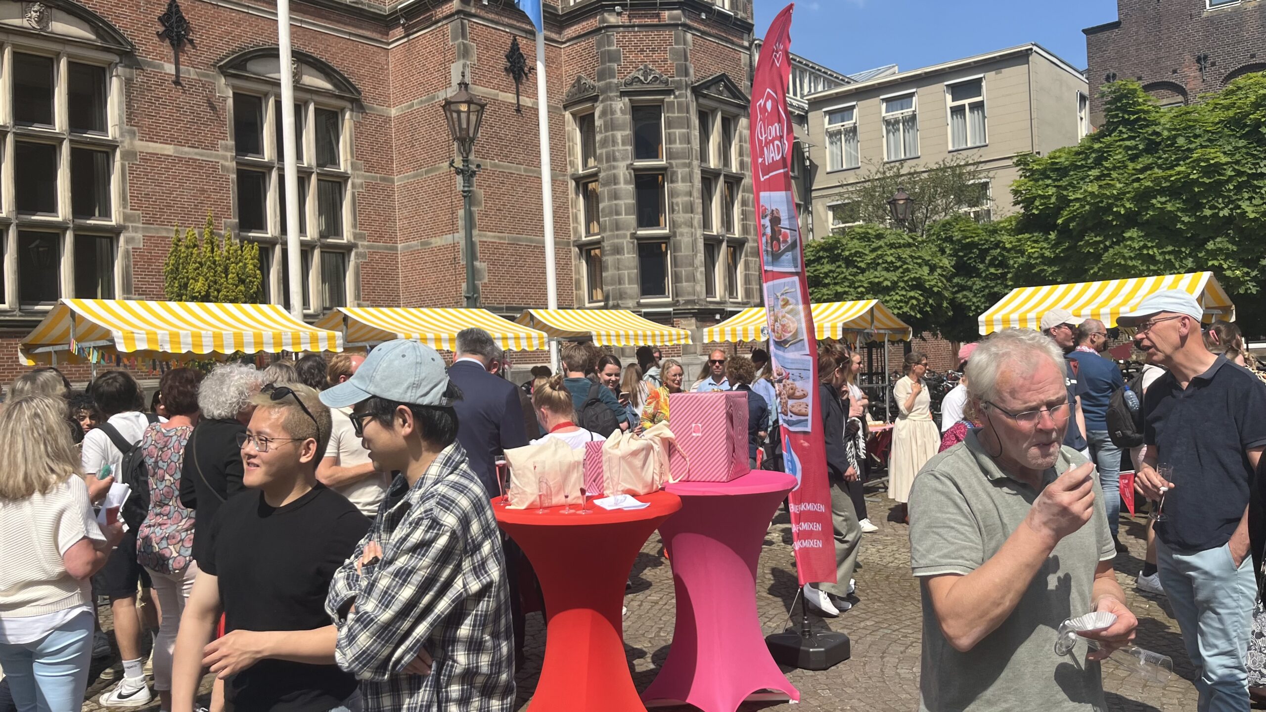 Het Academieplein was versierd met kraampjes waar de zelfgemaakte taarten tentoongesteld werden. Nadat de jury had geproefd waren de bezoekers aan de beurt. En dat trok veel bekijks. Zo’n vijftien deelnemers deelden stukjes van hun taart uit. Die taarten varieerden enorm, van een cheesecake tot een hartige taart. Toen alle taart zo goed als op was werd de top vier bekendgemaakt. De beste taartenbakker ontving een roze KitchenAid.