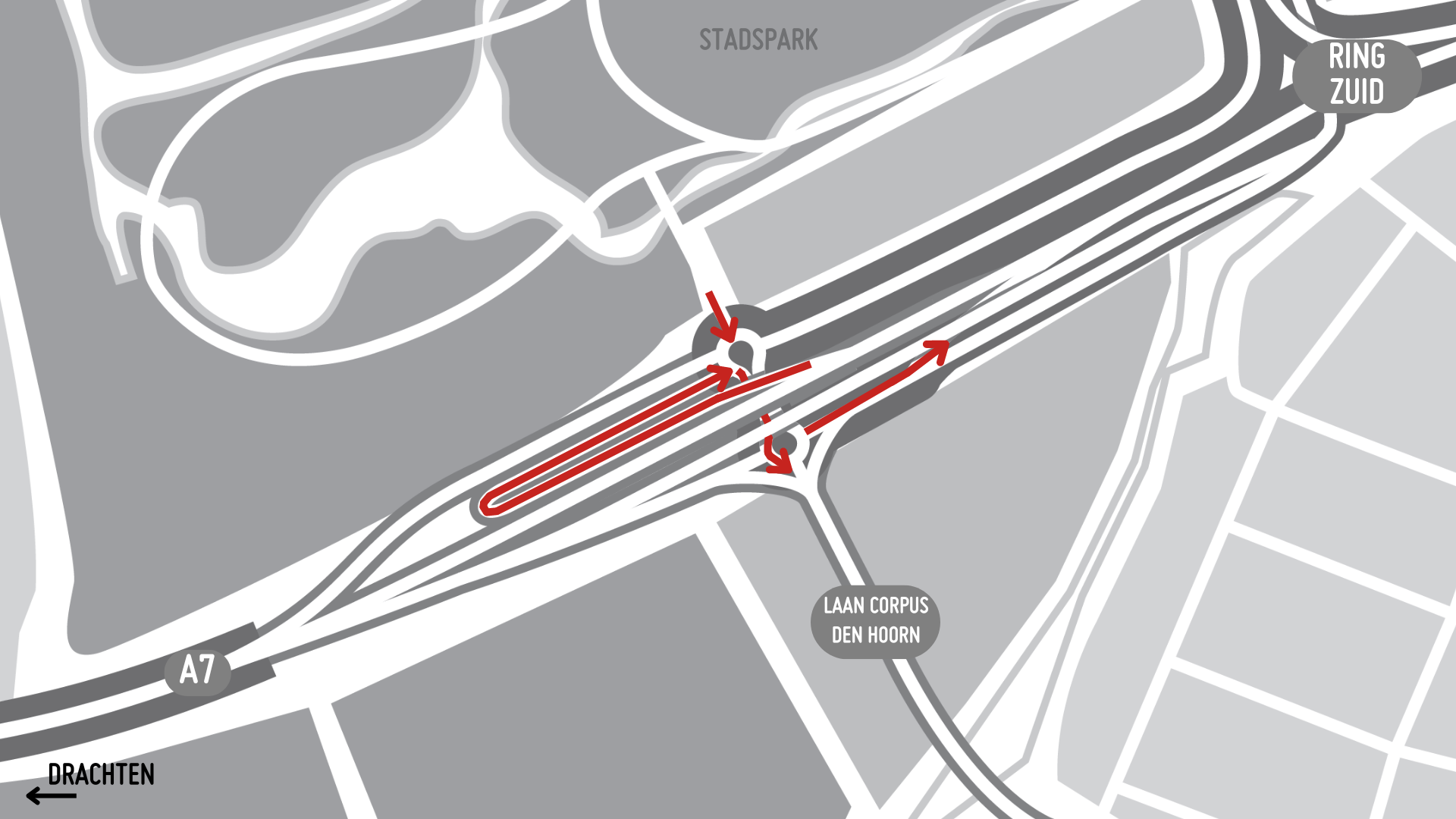 Meerdere op- en afritten van de dubbele rotondes ter hoogte van de Laan Corpus den Hoorn en het Stadspark gaan aankomende maandag 6 mei vanaf 06:00 uur dicht. Dit duurt tot 2 augustus.