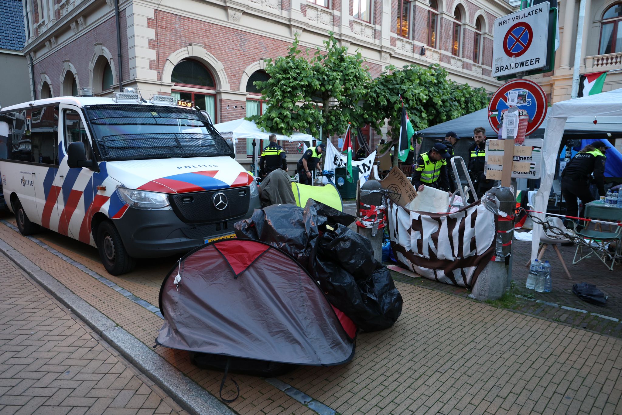 Volgens aanwezige fotografen in het tentenkamp is het ‘een bende’ op het Harmoniecomplex. Agenten waden zich door bergen afval, tenten en andere achtergelaten spullen. De gemeente is aanwezig met een vuilniswagen om de restanten van het tentenkamp af te voeren.