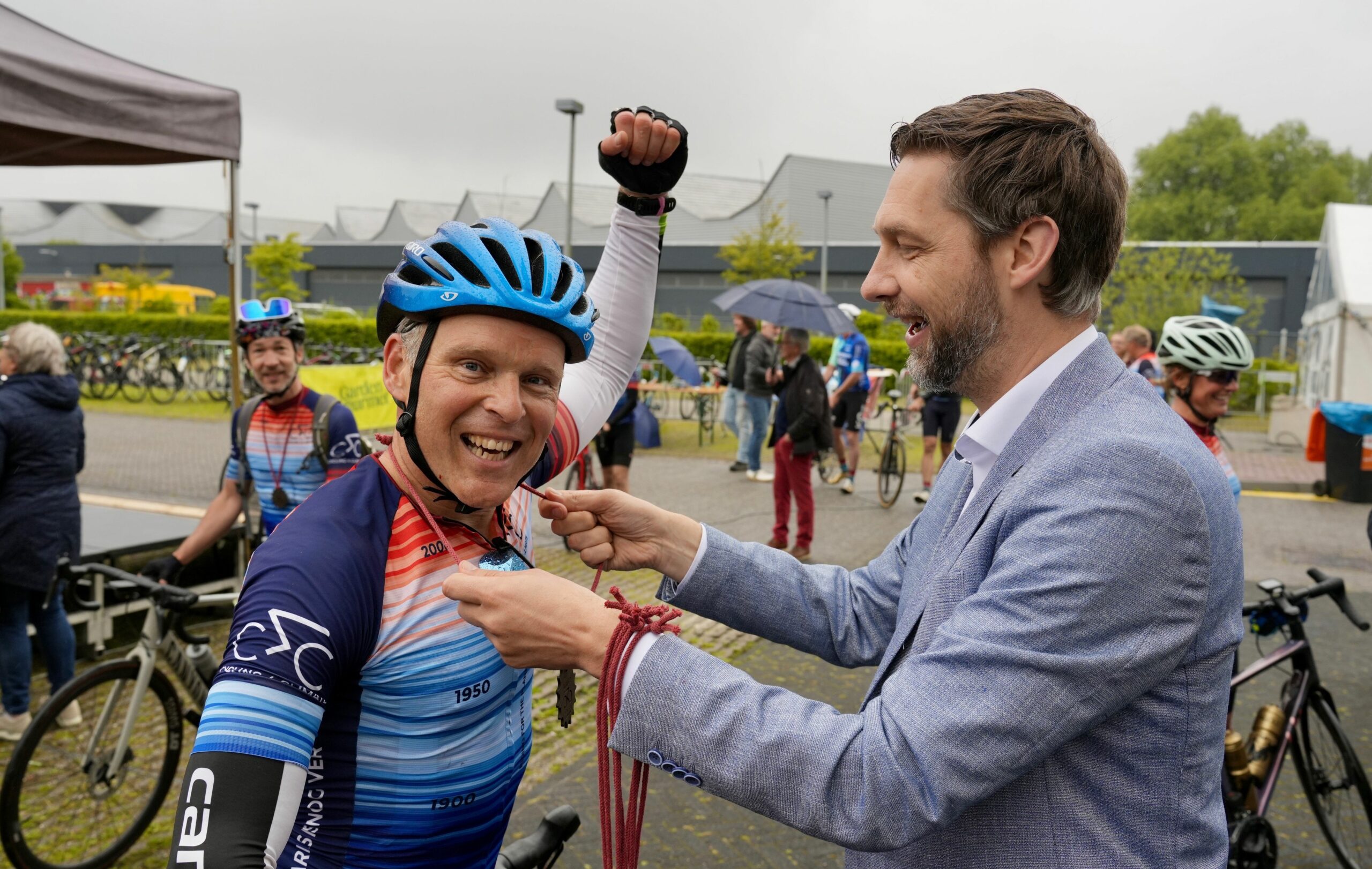 Vrijdagavond werden de deelnemers welkom geheten aan de finish: het kantoor van Waterschap Noorderzijlvest aan de Stedumermaar in Stad. Dijkgraaf Roeland van der Schaaf en gedeputeerde Johan Hamster heetten de fietsers daar welkom na de monstertocht. Samen met de organisatie van de Climate Classic overhandigden zij een symbolische cheque aan de programmadirecteur Femke Tonneijck van Wetlands International. van Wetlands International. Daarna kregen de deelnemers hun medailles.