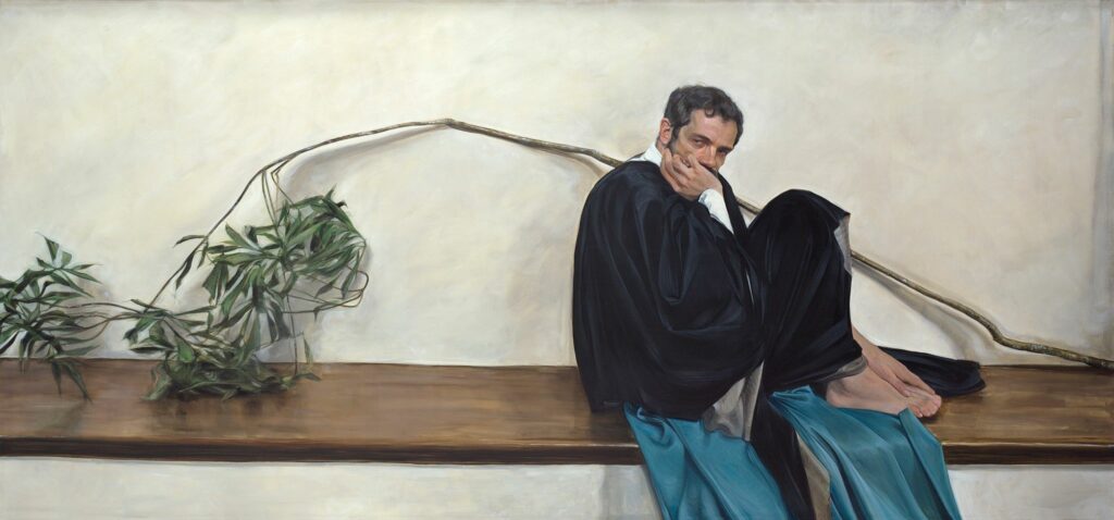 “Het laatste werk heeft als titel ‘De zorg voor de schepping’. Ik ben er ongeveer twee maanden mee bezig geweest. Ik heb best wel lang nagedacht hoe ik deze barmhartigheid uit zou kunnen beelden. Uiteindelijk heb ik bij de schepping een link gemaakt met het milieu. Op het schilderij zie je Wilbert van der Kamp. Wilbert is in Groningen bekend als iemand die meerdere initiatieven heeft opgezet waarmee hij simpeler voedsel beschikbaar wil stellen. Dat leek me heel passend. Grootste uitdaging in het werk was het schilderen van een dorre tak. Zoiets had ik nog niet eerder geschilderd. Maar uiteindelijk is dat heel goed gelukt.”