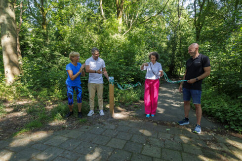 Olga Commandeur, bekend van het tv-programma Nederland in Beweging, opende deze woensdag twee wandelroutes Walk in the Parq, een bij de Helper Brink en een bij Trefpunt in Beijum.