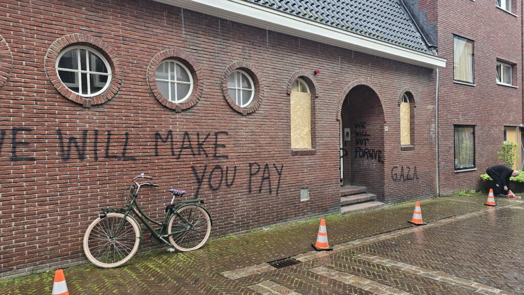 Een schoonmaakbedrijf is maandagmiddag begonnen met het schoonmaken van twee panden van de Rijksuniversiteit Groningen, nadat deze waren beklad met pro-Palestijnse leuzen. Bij het pand aan de Muurstraat werd ook een aantal ruiten ingegooid.