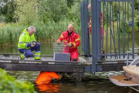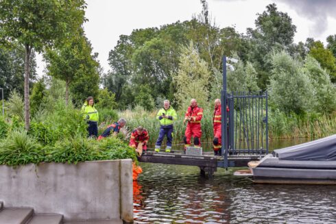 Hachelijke momenten zaterdagochtend voor een kat aan het Hoornsepad. Het dier was vast komen te zitten onder een steiger en kon daar niet zelfstandig vandaan komen.