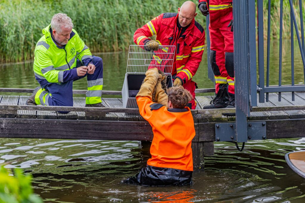 De melding van een dier in problemen kwam rond 11.30 uur bij de hulpdiensten binnen waarop een tankautospuit naar de locatie werd gestuurd. “Omstanders hadden alarm geslagen”, vertelt nieuwsfotograaf Rick ten Cate van tencatefotografie.nl. “Medewerkers van de Dierenambulance waren als eerste op de locatie. Al snel bleek dat de kat onder een steiger zat, boven het water, nabij het Best Western Hotel. Om het dier te kunnen redden was de hulp van de brandweer nodig. Eén van de brandweerlieden is in een waadpak het water ingegaan en heeft op die manier de kat kunnen bevrijden uit diens benarde situatie.”