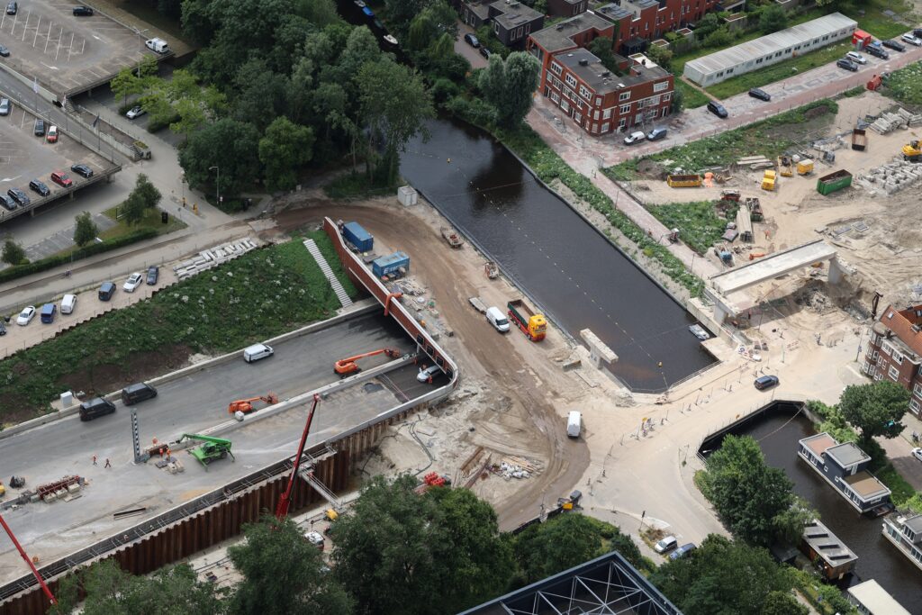 De oude ringweg is nog zichtbaar naast het gebouw van DUO en de Belastingdienst. Inmiddels is het asfalt hier verdwenen. In de rij met damwanden (in het midden van de foto) is een doorbraak gemaakt voor het bouwverkeer.