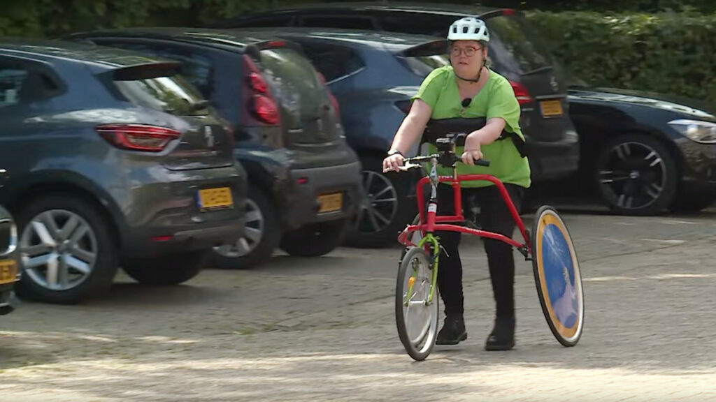 Een running frame heeft drie wielen, eentje voor en twee achter, zo vertelt Sanne. De framerunner zit op een zadel en de borst leunt op een borststeun. Bernard vult aan dat de runner op een soort driehoek zit en dat het daarmee een soort loopfiets is.