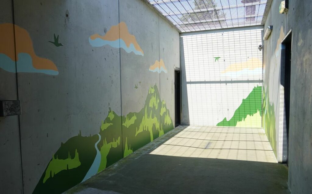Een groep studenten van Academie Minerva heeft de afgelopen weken landschappen geschilderd op de betonnen muren van zes luchtplaatsen in de cellencomplexen in Leeuwarden en Groningen. “De luchtplaatsen waren saaie betonnen ruimtes waar je alleen door omhoog te kijken, door het rasterwerk, het idee kreeg dat je buiten was,” vertellen Frans Vos en Baukje Meindertsma, beveiligers van arrestanten in de cellencomplexen. “Onze verantwoordelijkheid op het cellencomplex is de zorg voor ingeslotenen. Dat doen we zonder over hen te oordelen. We hebben immers te maken met verdachten en niet reeds veroordeelden. Vanuit die zorgtaak zijn we dit project gestart.”