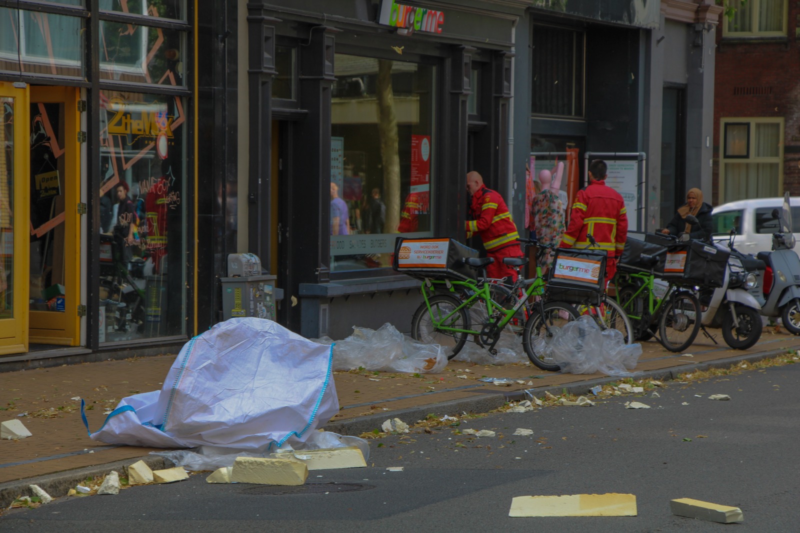 De problemen in de Herestraat ontstonden rond 16.30 uur. “Van een dak zijn bouwmaterialen naar beneden gevallen”, vertelt de nieuwsfotograaf. “De straat ligt bezaaid met rommel. De hulpdiensten hebben vanwege de veiligheid de straat afgesloten.” De brandweer moest ook in actie komen bij Rooftop Merckt aan de Grote Markt. Wind: “Doeken of zonneschermen die op het dak hangen dreigen naar beneden te vallen. Een deel van de straat is afgesloten.” Uiteindelijk heeft de eigenaar van het gebouw, met hulp van boa’s, de doeken verwijderd.