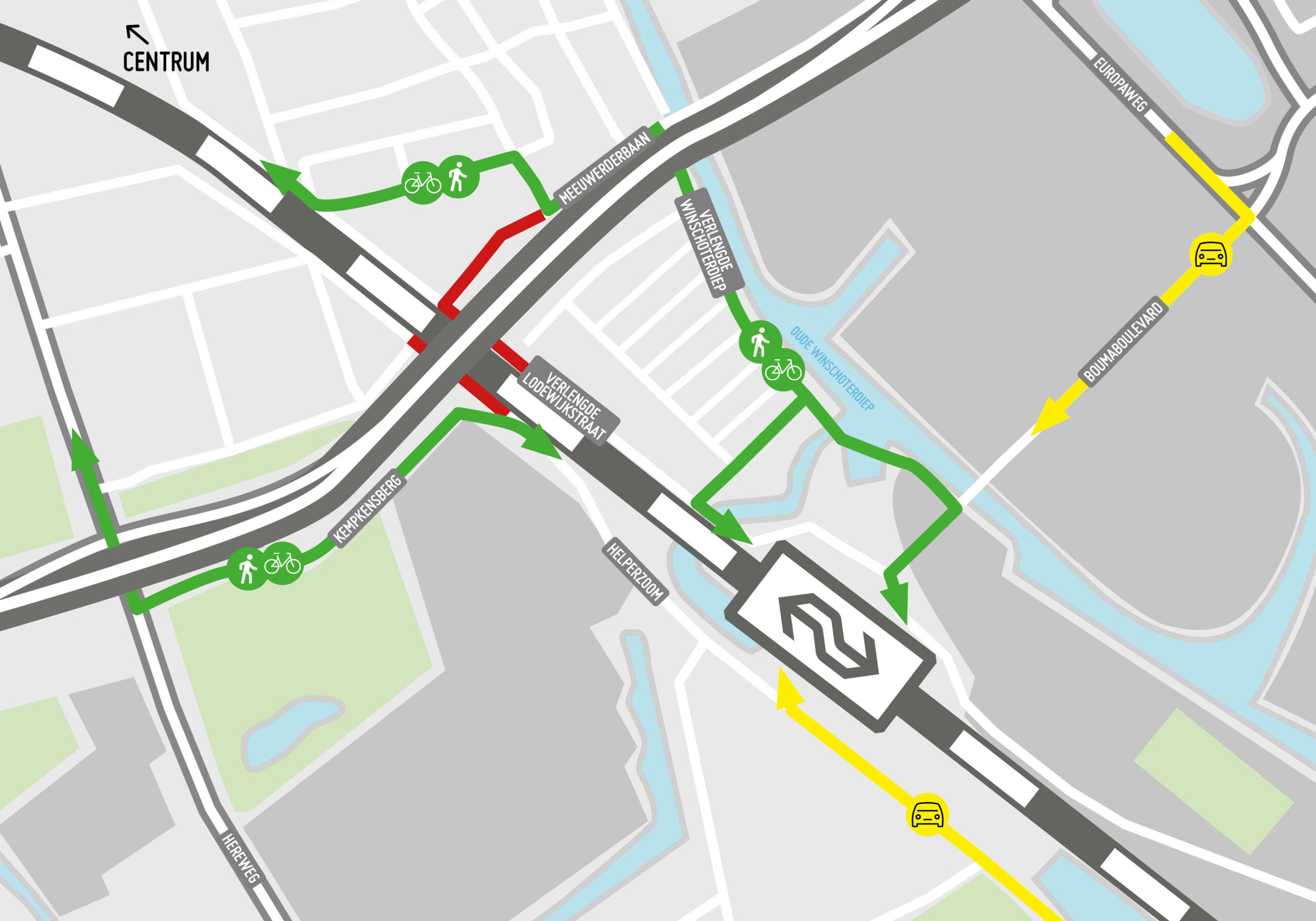 Vanwege de werkzaamheden zijn de onderdoorgang bij de Verlengde Lodewijkstraat en de Helperzoom al enige tijd dicht. Fietsers en voetgangers van en naar Station Europapark kunnen gebruik maken van een tijdelijk pad langs het Oude Winschoterdiep, of via Helperzoom, Kemkensberg en Hereweg. Autoverkeer kan het Europapark bereiken via de Helperzoom of Europaweg en Boumaboulevard.