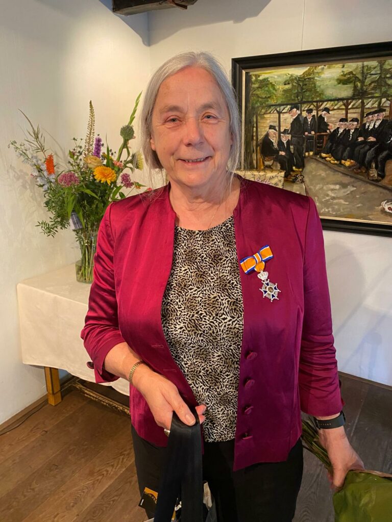 Schuiling speldde Heesink de versierselen op die horen bij haar benoeming tot Ridder in de Orde van Oranje-Nassau.