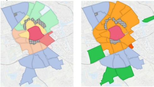 Op het linker kaartje de huidige zones, rechts de nieuwe situatie. De rode zone is de eerste zone. Oranje is de tweede zone. Grijs/blauw is de derde zone en groen zone vier.