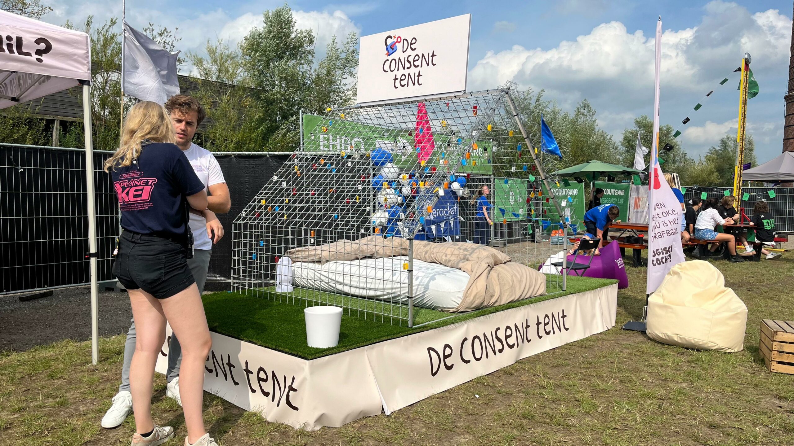 Bij de consenttent staan mensen van het Centrum Seksueel Geweld. Ze gaan in gesprek met jongeren en vragen ze om een slotje aan de consenttent op te hangen om steun te betuigen aan het vragen van consent. “Er zijn ook mensen die zeggen: je voelt toch wel of mensen iets oké vinden. Soms weten wat dat niet zo is. Iemand kan soms ook verstijven op sommige momenten. Dus het is goed om ook te checken of dat flirten of je gedrag wel oké is,” vertelt Martijn Schokker van Centrum Seksueel Geweld.