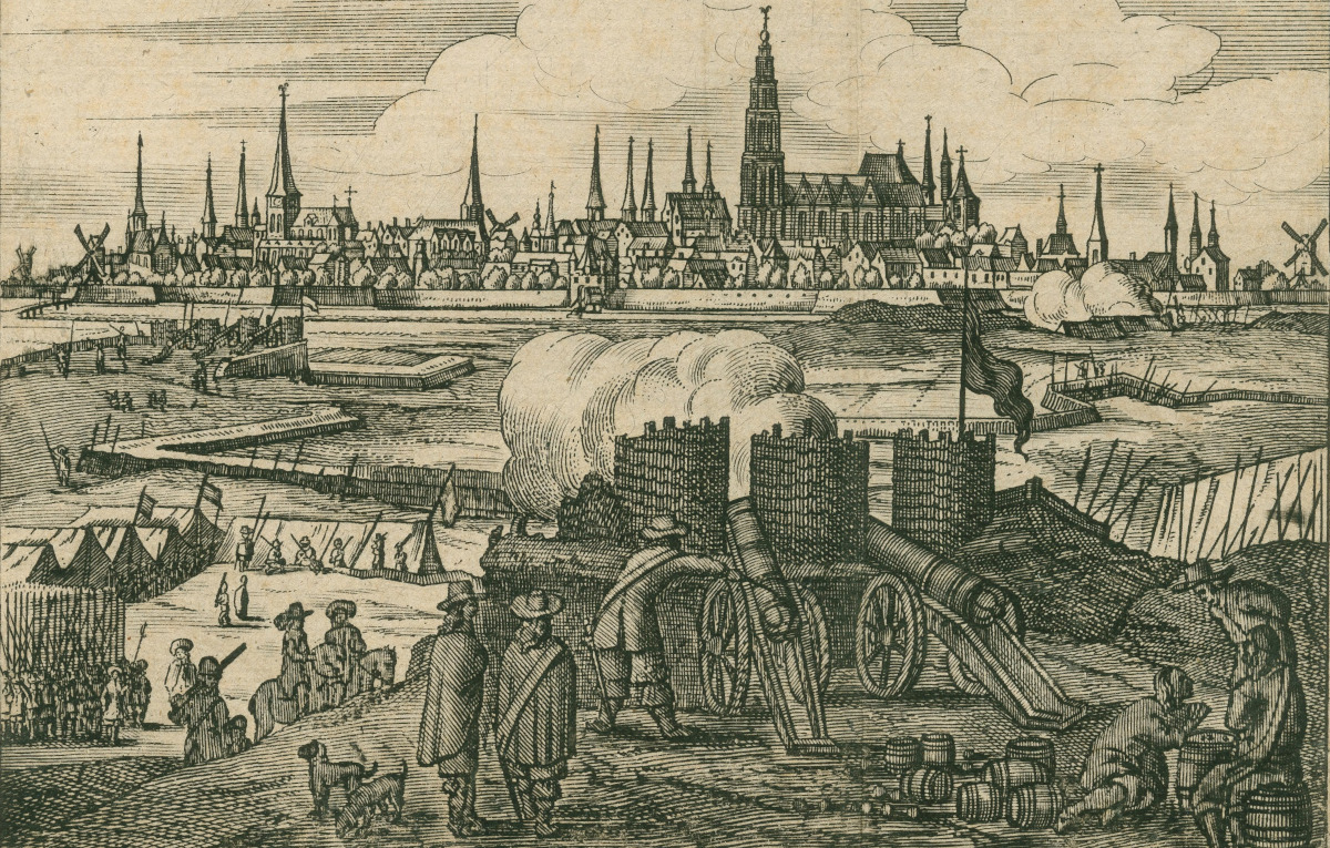 (Deel van) kopergravure van het beleg van Groningen in 1672. Op de achtergrond de stad gezien vanuit het zuiden, op de voorgrond verschanskorven en kanonnen. Bron: deelnemer Beeldbank, Groninger Archieven