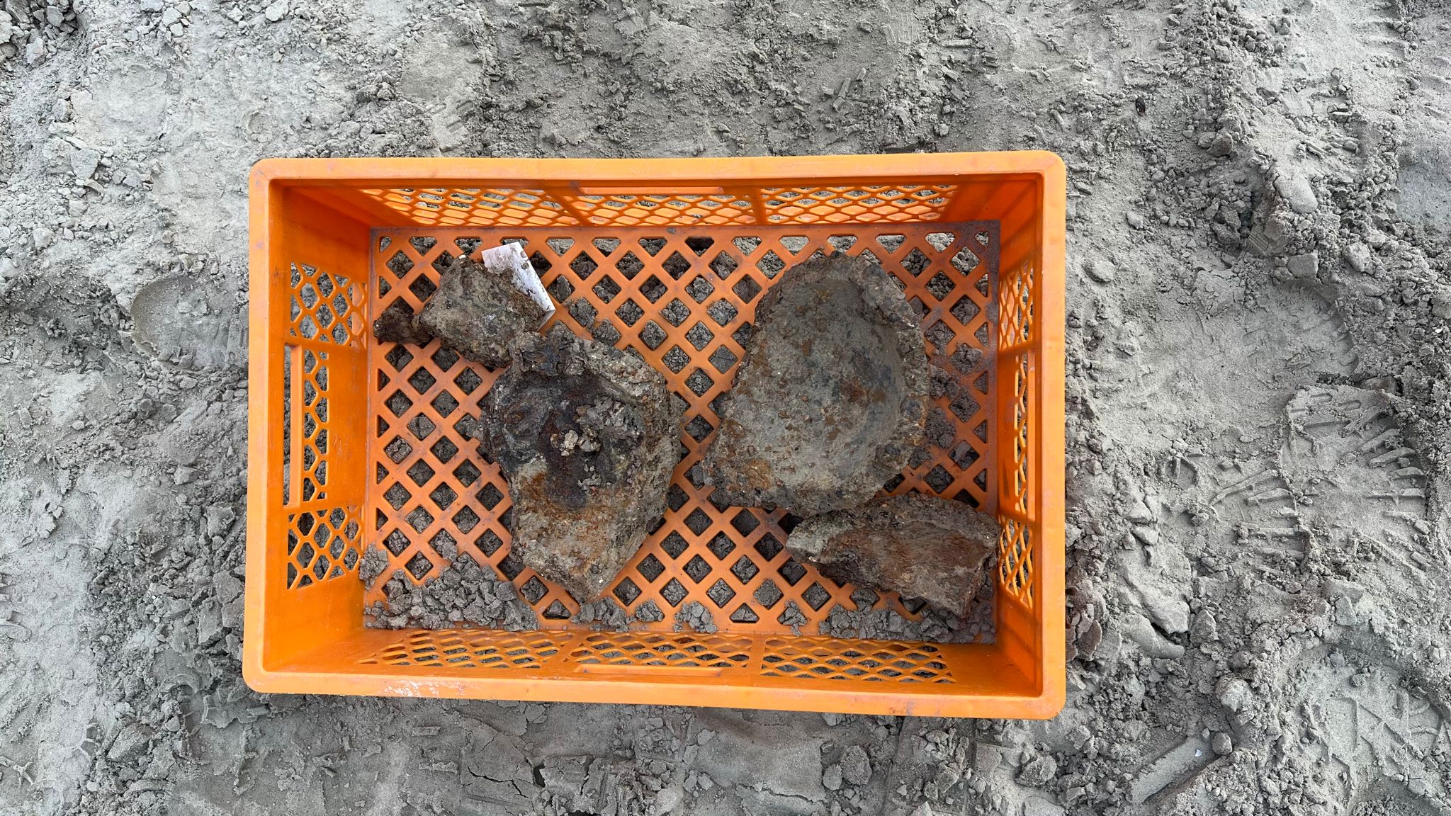 De bom die bij VRIJDAG is gevonden is ontploft. De scherven zijn later door iemand bij elkaar in een gat gegooid. “De stad lag in puin en overal lagen dit soort scherven van bommen. Ik denk niet dat iemand dat in z’n tuin wil hebben, dus is het in een kuil gegooid.” vertelt gemeentearcheoloog Felicia Kalkman-Hulshof.