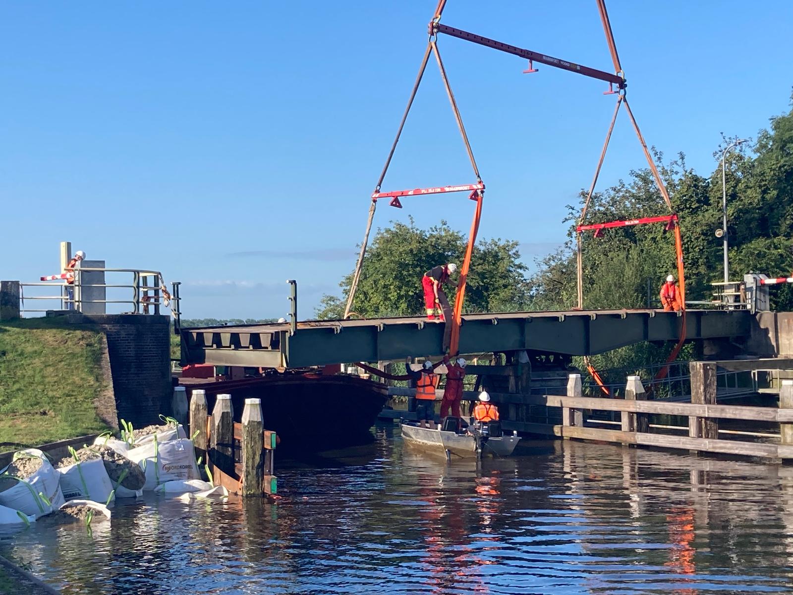 De beschadigde brug over het Reitdiep bij Wierumerschouw is donderdagmorgen rond 08.00 uur zonder problemen van zijn plek gehesen. De brug moet gerepareerd worden na een aanvaring.