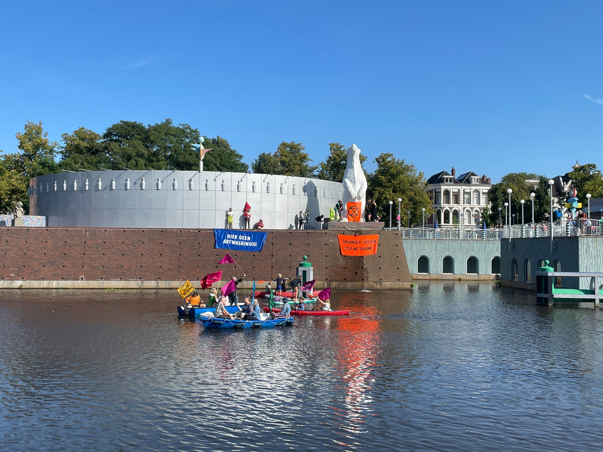 De afgelopen periode hebben de klimaatactivisten vaker op deze locatie geprotesteerd. Men verzamelde zich zaterdagochtend bij de Pissende IJsbeer. Er werden spandoeken opgehangen met daarop teksten als ‘Hier geen artwashing’ en ‘Groninger Museum stop met Gasunie’. Diverse activisten gingen in bootjes en kano’s het water op. “De Gasunie doet aan artwashing”, laat een woordvoerder van Extinction Rebellion weten. “Het staatsbedrijf maakt goede sier met sponsoring van het museum en de kinderbiennale. Intussen is het bezig de toekomst van diezelfde kinderen te vernietigen.”