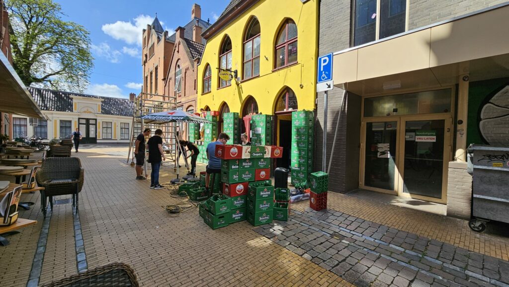“Ik denk dat je het in zijn totaliteit over meer dan vijfhonderd kratten hebt. Dertig van Desperado, zeventig van Amstel en zo’n 350 van Heineken. Laatstgenoemde merk is onze bierleverancier. Zij denken ook altijd mee en helpen mee bij het design. Je moet trouwens niet denken dat we als vereniging deze kratten allemaal leeggedronken hebben hoor. Ook dat is onderdeel van de voorbereiding: op verschillende plekken worden er kratten verzameld en ingezameld zodat wij die kunnen gebruiken.”