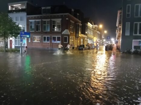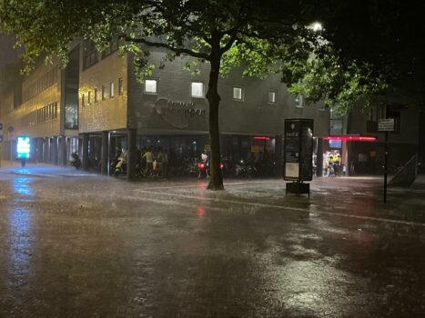 Op de Grote Markt vindt dinsdagavond Night of the Songs plaats. Dit is een karaoke-evenement waarbij studenten en inwoners worden uitgedaagd om mee te zingen met allerlei bekende liedjes. “Rond 22.30 uur begon het stevig te hozen. Ook was er flink wat onweer”, vertelt een nieuwsfotograaf. “Binnen enkele minuten was de Grote Markt leeg. Aanwezigen zochten een veilig heen komen. Toch is het niet iedereen gelukt om droog te blijven.”