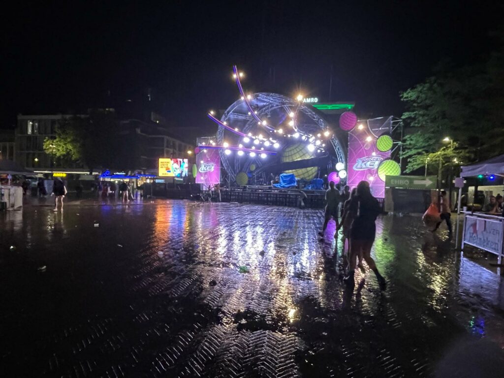 Forse regen- en onweersbuien trokken dinsdagavond over Stad. Vanwege het noodweer moest het KEI-feest op de Grote Markt tijdelijk worden stilgelegd.