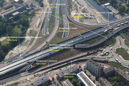 Van het Julianaplein tot aan de Europaweg wordt nog op veel plekken gewerkt. Zo lijkt het Julianaplein vanuit de lucht al zo goed als af. Maar aan alle nu nog gesloten verbindingswegen (de tunnelboog tussen Hoogezand en Assen en de verbindingswegen tussen Drachten en Hoogezand in beide richtingen) wordt nog gewerkt.