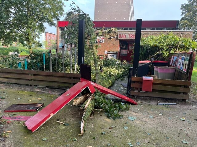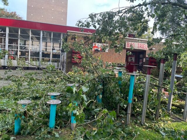 “Toen ik hier woensdagochtend kwam, heb ik direct contact gezocht. Het moest opgeruimd worden. Na lang bellen kwamen in de middag hier twee mannen die geholpen hebben om het op te ruimen. Dat hebben ze super goed gedaan. Maar qua schade ga ik de gemeente hier wel verantwoordelijk voor stellen. We weten dat het klimaat aan het veranderen is. En dat het belangrijk is dat je dingen moet onderhouden. Ik denk dat daar ook de uitdaging ligt: om voor de klimaatverandering uit te lopen.”