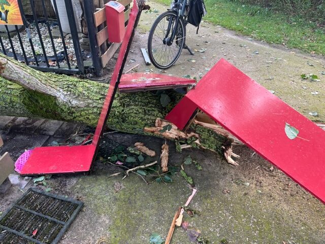 “Dinsdagavond trokken er zware buien over Groningen. Er was veel weerlicht en er viel flink wat neerslag. Bij mijn sportcentrum is een grote tak naar beneden gekomen. Deze tak, die een doorsnee heeft van zo’n veertig centimeter, is op mijn terrein terecht gekomen. De toegangspoort is daarbij kapot gegaan, verschillende potten met plantjes zijn beschadigd geraakt, lampen en ook een deel van het hekwerk hebben het niet overleefd. In totaal schat ik de schade op zo’n drieduizend euro.”