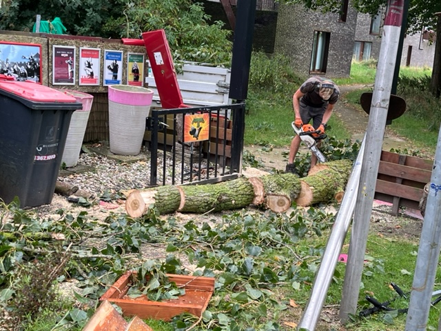 “Nee, nog niet alles is weggehaald. Er zit nog een gedeelte in de boom dat los zit. Dat moet nog weggezaagd en weggehaald worden.”