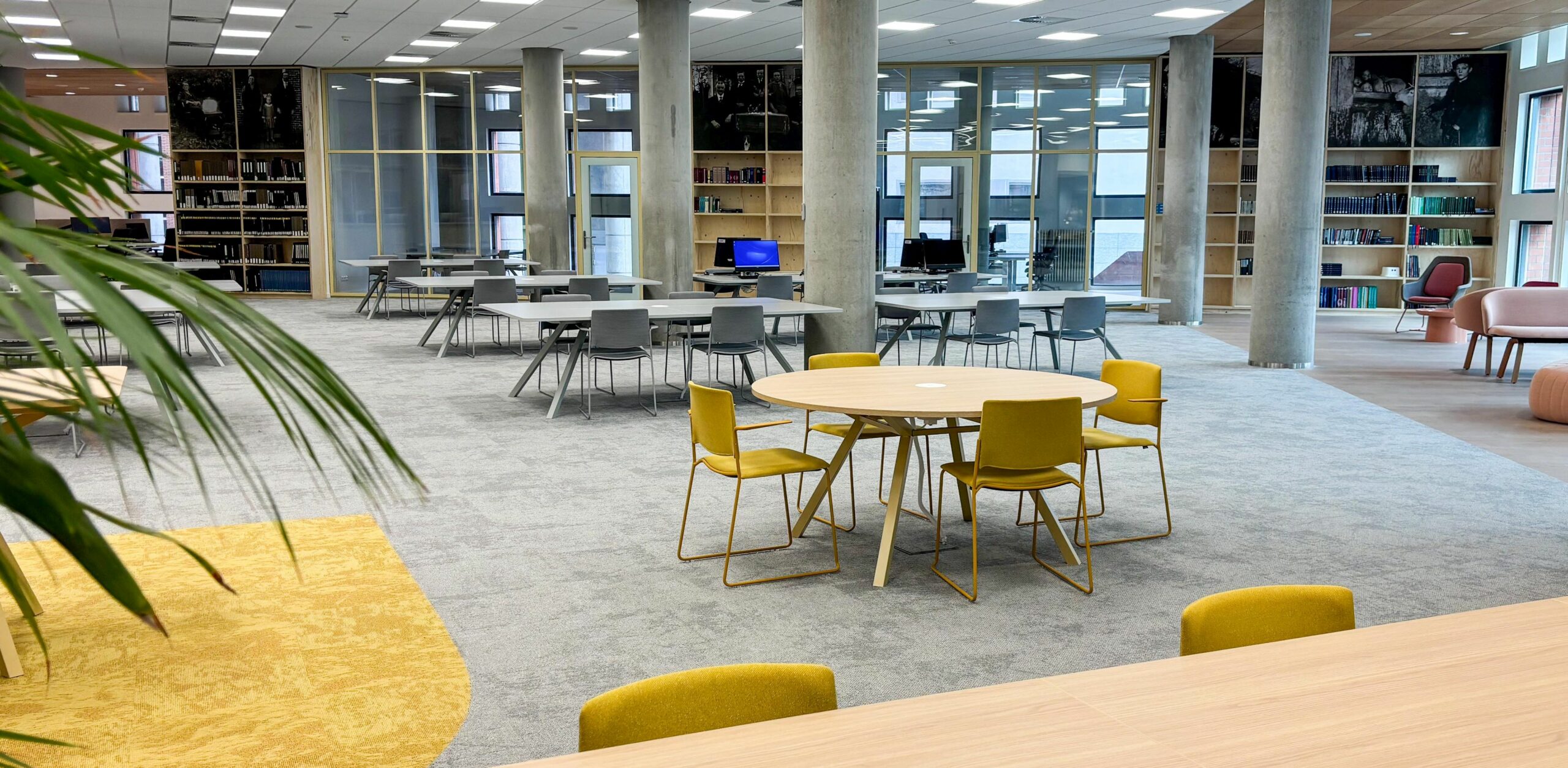 De nieuwe studiezaal heeft een meer open en flexibel karakter en bestaat uit verschillende zones en ruimtes In de ‘collectiezone’ en stilteruimte kunnen bezoekers werken met stukken. In de ‘collectiezone’ is het geen probleem om te overleggen, in de stilteruimte mag dat niet. De projectzone, te herkennen aan de gele en roze stoelen, biedt flexibele werkplekken. Maar werken met stukken mag hier niet. Ook hebben de vrijwilligers van de Groninger Archieven hier nu apart werkplekken, niet bedoeld voor bezoekers.