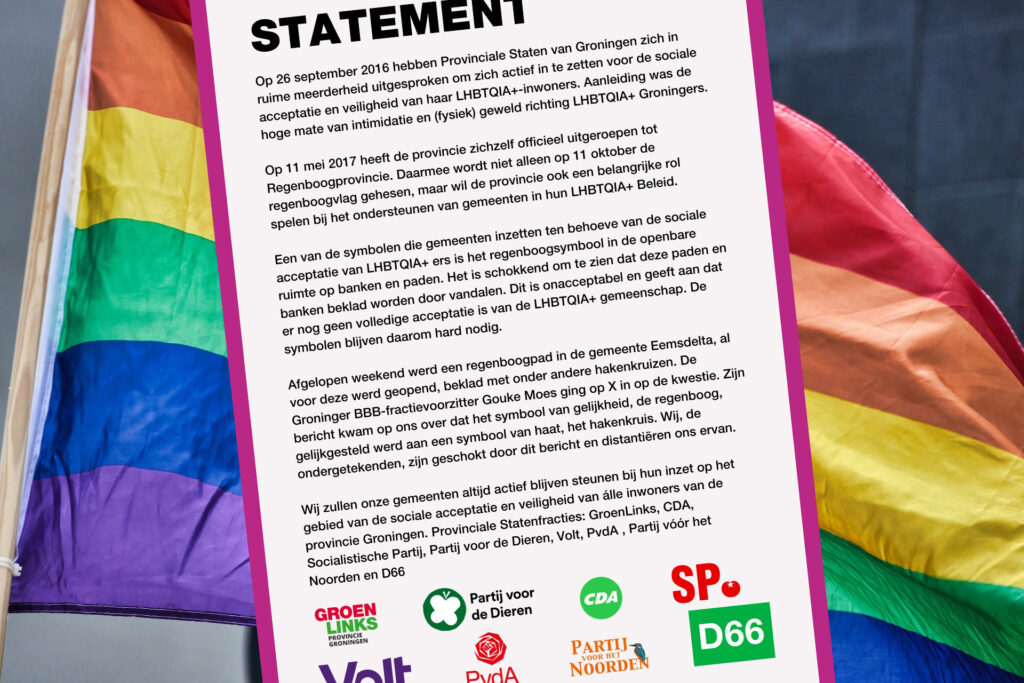 “Zijn bericht kwam op ons over dat het symbool van gelijkheid, de regenboog, gelijkgesteld werd aan een symbool van haat, het hakenkruis”, schrijven de Statenfracties van GroenLinks, CDA, Socialistische Partij, Partij voor de Dieren, Volt, PvdA, Partij vóór het Noorden en D66 in een gezamenlijk statement. “Wij zijn geschokt door dit bericht en distantiëren ons ervan. Wij zullen onze gemeenten altijd actief blijven steunen bij hun inzet op het gebied van de sociale acceptatie en veiligheid van álle inwoners van de provincie Groningen. ”