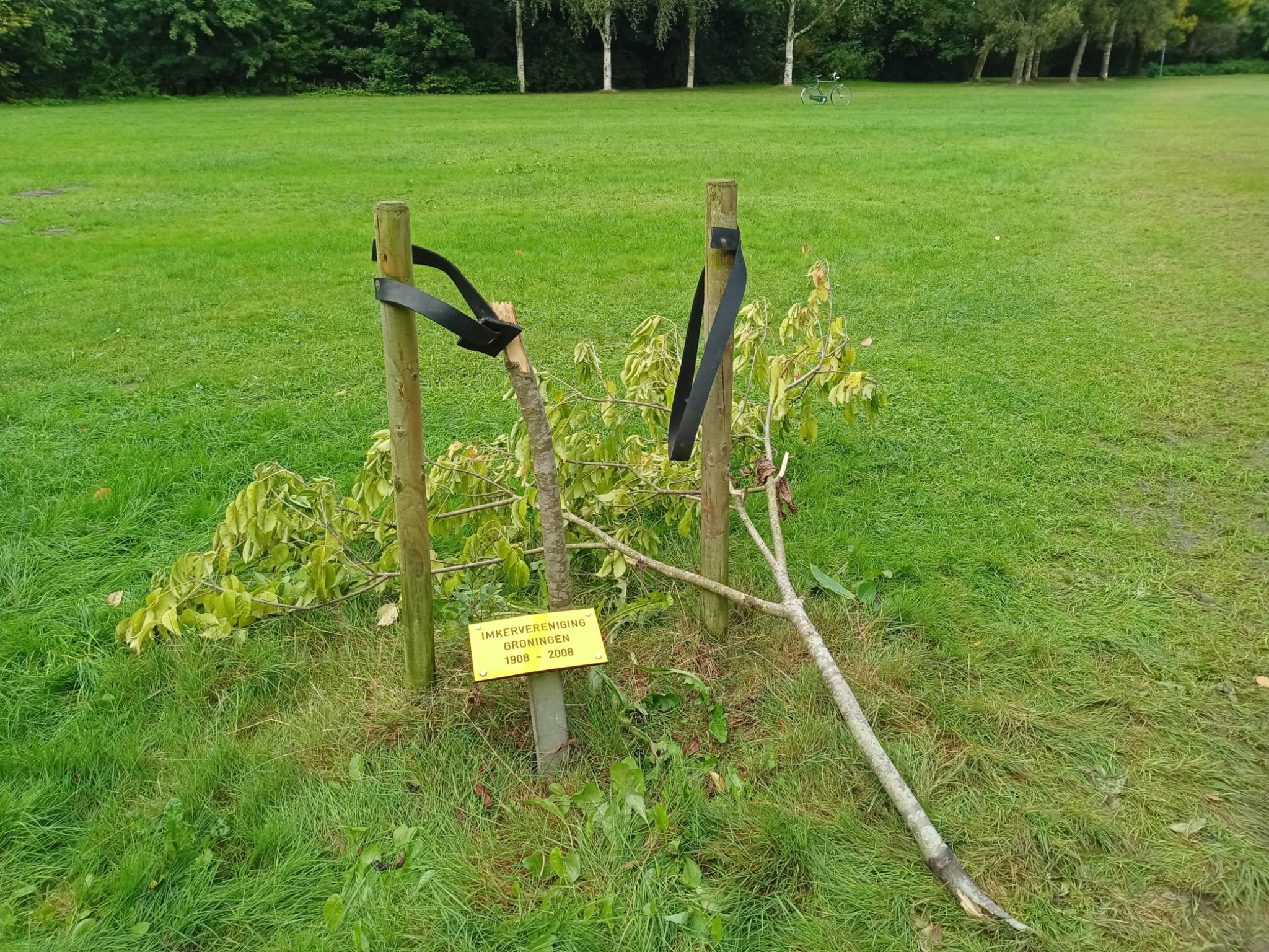 “De honingboom is een geschenk van de Groninger imkervereniging”, vertelt Lucy Pijttersen van Stadspark Natuurlijk. “Afgelopen voorjaar is de boom op zijn definitieve plek gezet in het voorpark van het Stadspark.” Toevallig was dat ook de plek waar afgelopen weekend fietsenrekken voor het Hullabaloo Festival stonden opgesteld. “Afgelopen week zijn deze fietsenrekken verwijderd. Naar alle waarschijnlijkheid is bij die werkzaamheden, waarbij men rücksichtslos te werk ging, de boom geveld.”
