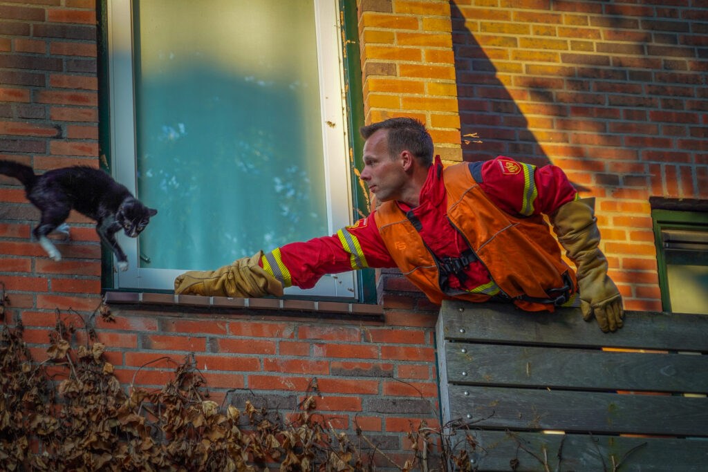 Tijdens de reddingsoperatie sprong het beestje echter zelfstandig naar beneden. “Het kwam op vier pootjes op de grond terecht. Medewerkers van de Dierenambulance, die ook ter plaatse waren, hebben in de omgeving nog gezocht naar het dier, maar de kat liet zich niet meer zien.” De hulpdiensten zijn daarop weer teruggekeerd naar de kazerne.