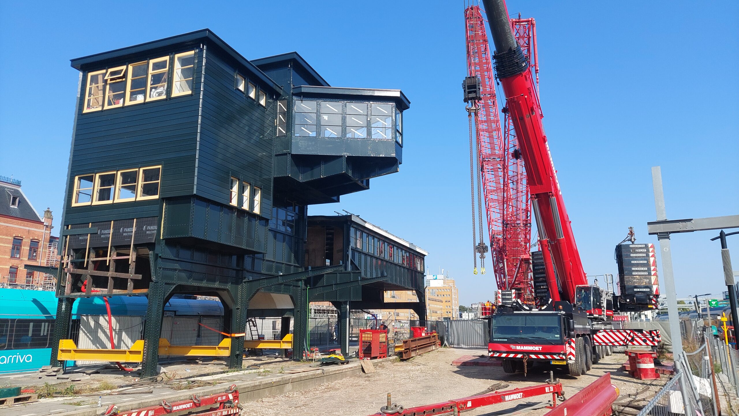 Het seinhuis weegt 90,5 ton en de loopbrug 120 ton. Om ze terug te plaatsen zette aannemer Strukton een grote kraan in. Deze kraan is zo groot dat het opbouwen ervan in totaal vijf dagen duurt. De loopbrug verhuist als eerste, in de nacht van vrijdag op zaterdag. In de volgende nacht volgt het seinhuis. Het hijsen begint beide nachten rond 23.00 uur. Naar verwachting zullen het seinhuis en de passerelle tussen 5.00 en 6.00 uur weer op hun plek staan. Na de verplaatsing zijn er opnieuw vijf dagen nodig om de kraan weer af te bouwen.