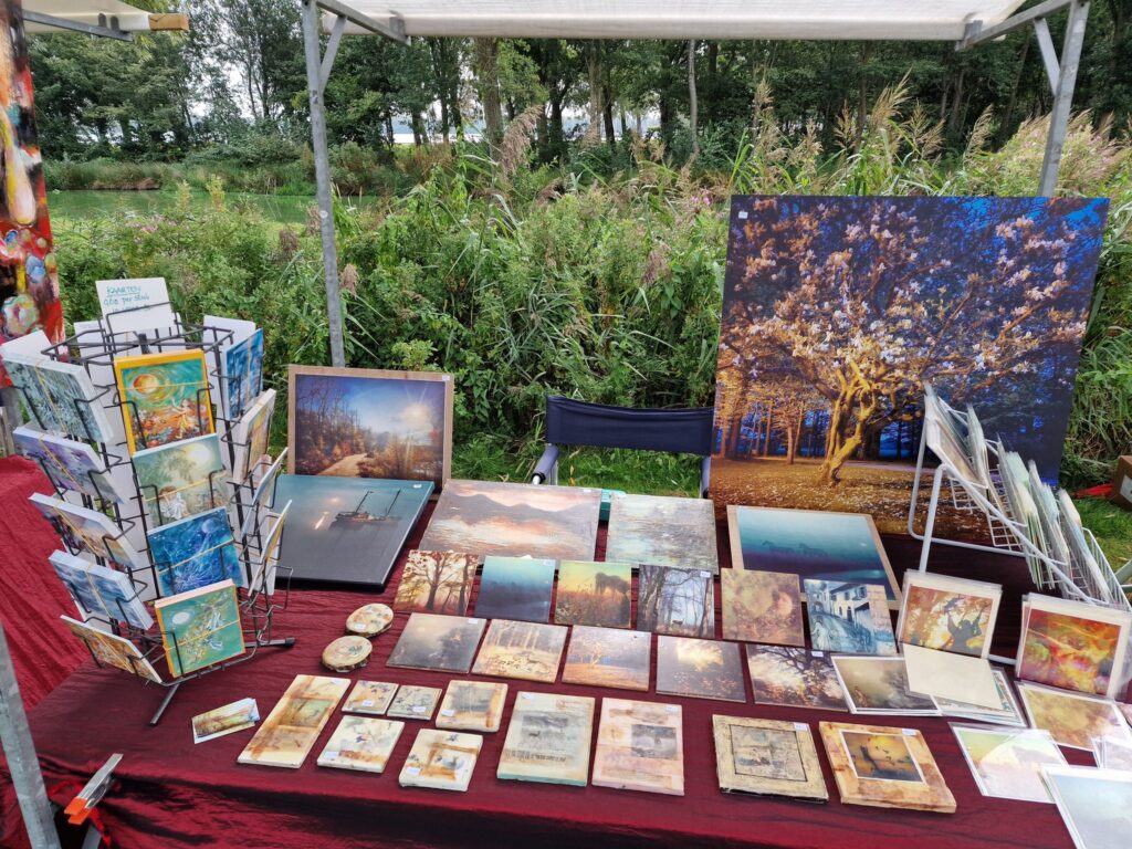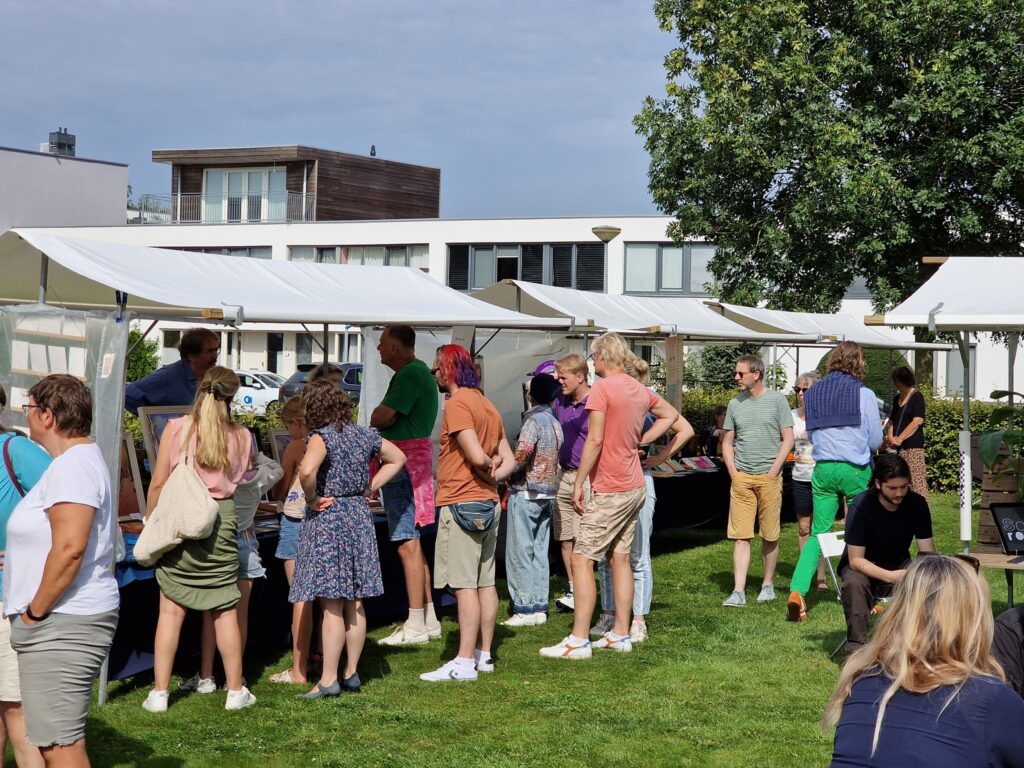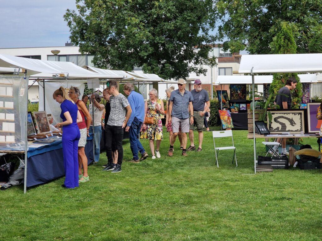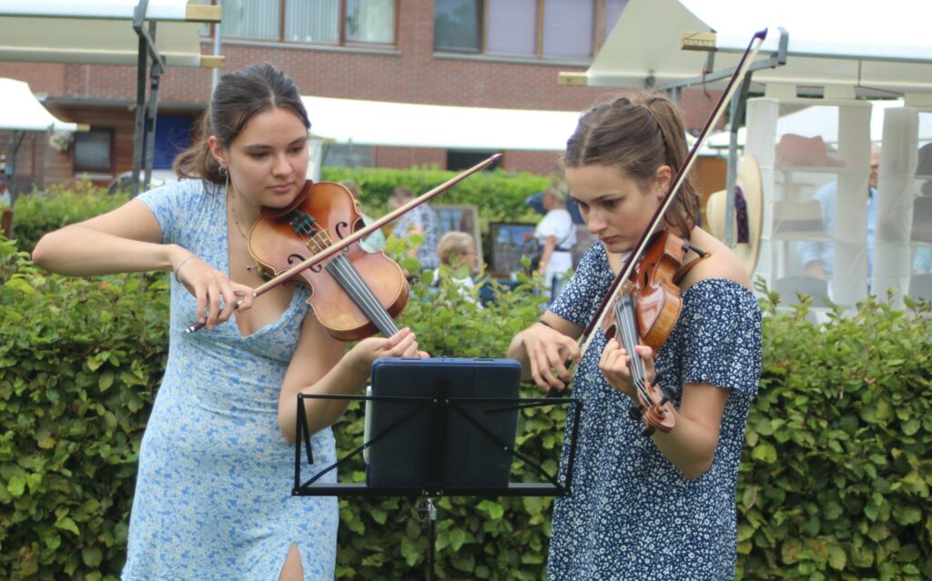 “De weersomstandigheden waren ideaal. Het was stralend weer. Zo nu en dan was er een wolkje, wat wel fijn was, want anders brandde je weg. Daarnaast was het aanbod op de kunstmarkt heel breed. We hadden diverse soorten kunst: van keramiek, schilderijen, tegelkunst, foto’s, sieraden, hoeden, glaskunst, kleurrijke garens, dichtkunst en beelden. Maar er was ook catering aanwezig en er was muziek. Duo The Match was er bijvoorbeeld. Jaren geleden kwamen deze dames als ukkies naar ons toe met de vraag of zij liedjes mochten spelen op de vrijmarkt op Koningsdag. De ukkies van toen zijn inmiddels vrouwen die afgestudeerd zijn aan het conservatorium in Stad. Toch blijven ze ons trouw, en dat is echt fantastisch. Ook het trio Pot Laban Baumgarten trad op. Zij maakten prachtige muziek dat veel bezoekers een vakantiegevoel gaf.”