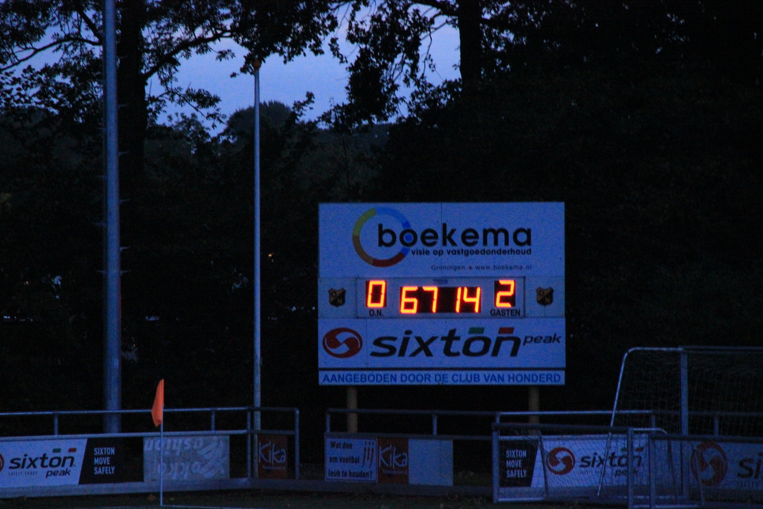 Foto Andor Heij. Alleen het scorebord gaf nog licht langs het veld bij Oranje Nassau - Drachtster Boys
