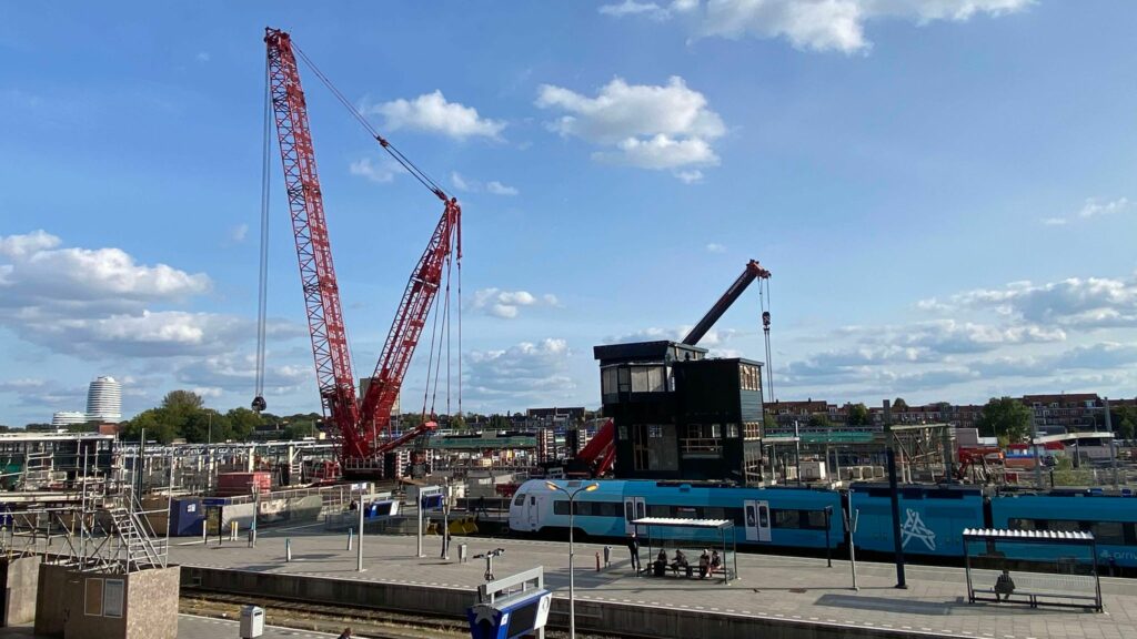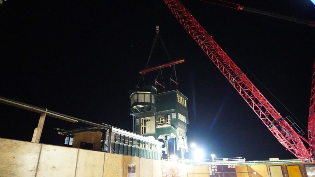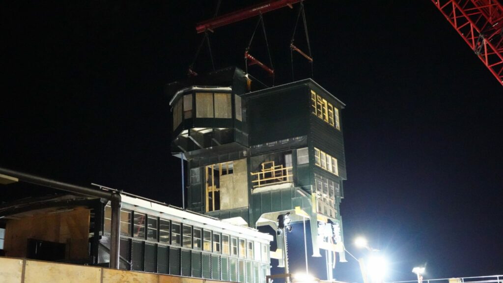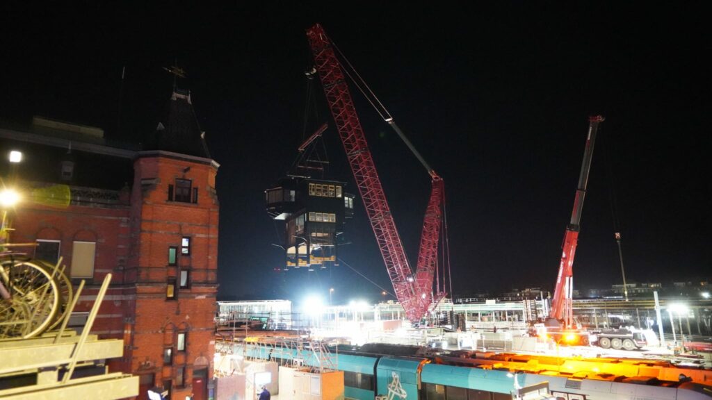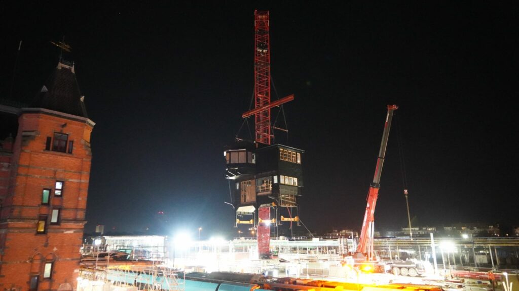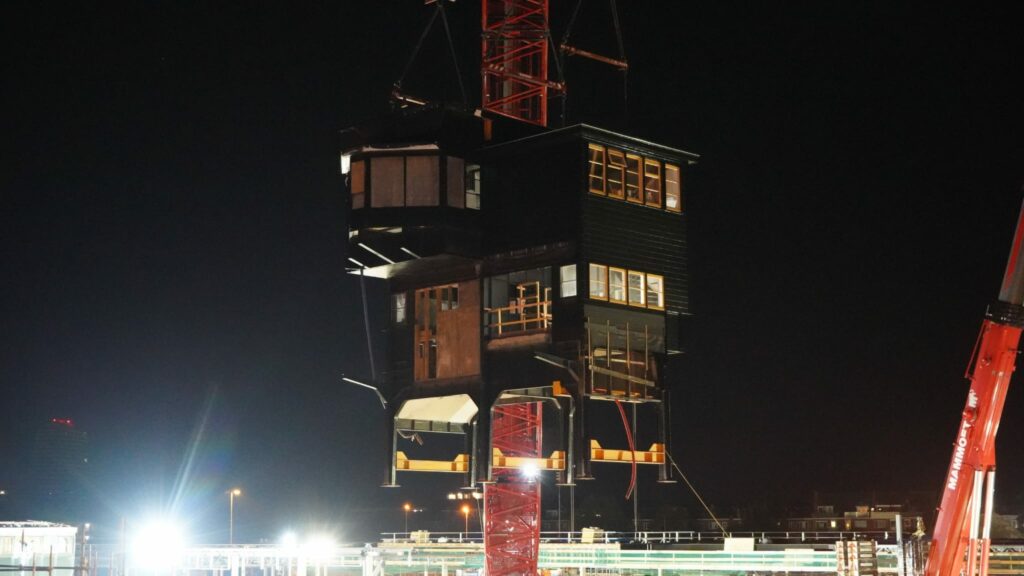 Nadat in de nacht van vrijdag op zaterdag de loopbrug al op zijn plek werd gehesen is het aannemer Strukton en spoorbeheerder ProRail afgelopen nacht gelukt om ook het monumentale seinhuis op de definitieve plek te plaatsen.