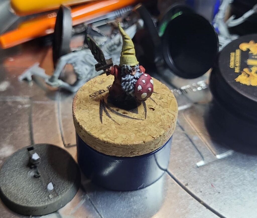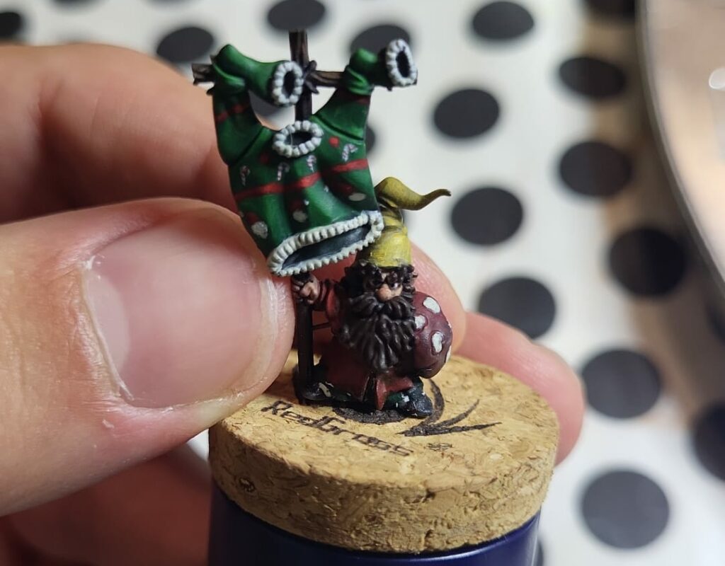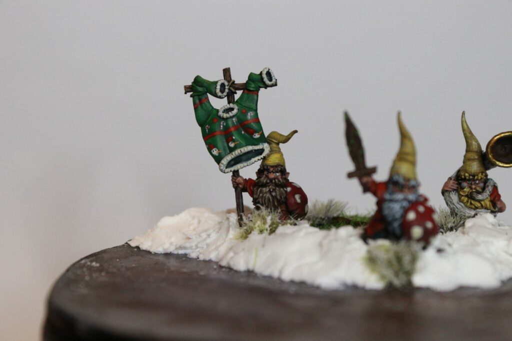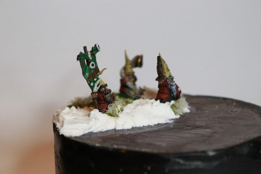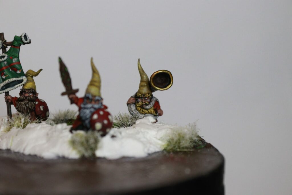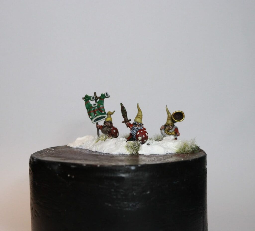 Om het zo mooi mogelijk te maken maakt Jeffery gebruik van verschillende kwastjes. “De afmeting van dit miniatuurtje is niet de uitdaging. Dat zit hem in de gezichtsuitdrukking die ik het mee wil geven. Kijk, ik ben nu bijvoorbeeld bezig om het neusje van deze kabouter op zo’n manier rood te maken dat er een drankneusje ontstaat. Zie je hoe de kabouter helemaal tot leven komt? Voor dit scenario maak ik gebruik van drie kabouters van de Gnome Toad Riders. Eén heeft een zwaard in de aanslag, de andere twee dragen een muziekinstrument en een soort vlag. Hen plaats ik in een landschapje.”