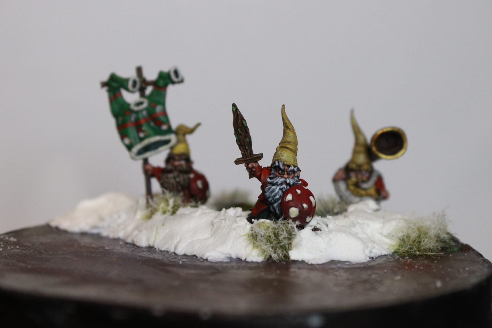 Om het zo mooi mogelijk te maken maakt Jeffery gebruik van verschillende kwastjes. “De afmeting van dit miniatuurtje is niet de uitdaging. Dat zit hem in de gezichtsuitdrukking die ik het mee wil geven. Kijk, ik ben nu bijvoorbeeld bezig om het neusje van deze kabouter op zo’n manier rood te maken dat er een drankneusje ontstaat. Zie je hoe de kabouter helemaal tot leven komt? Voor dit scenario maak ik gebruik van drie kabouters van de Gnome Toad Riders. Eén heeft een zwaard in de aanslag, de andere twee dragen een muziekinstrument en een soort vlag. Hen plaats ik in een landschapje.”