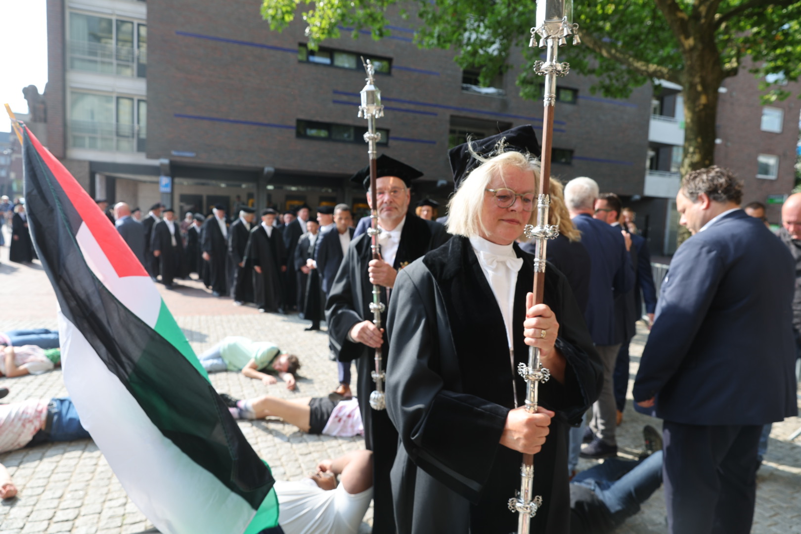 Rectoren van Rijksuniversiteit Groningen liepen maandagmiddag in toga van het Academiegebouw naar de Martinikerk. Voordat ze de deur binnen konden, moesten ze wel eerst over een aantal Pro-Palestijnse activisten stappen.