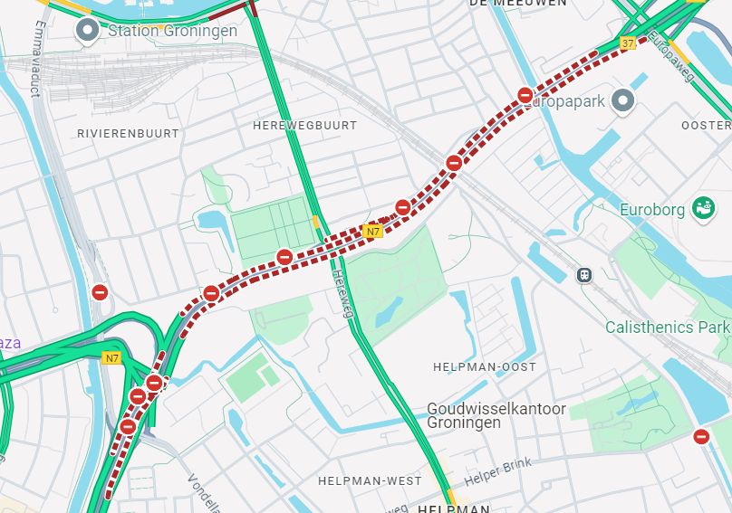 Waar veel auto’s doodleuk weer onbelemmerd doorrijden over de ringweg, laat Google Maps bestuurders nog doodleuk een ‘rondje ringwegen’ rijden of stuurt ze door de zuidelijke wijken van Stad. Sommige van de stremmingen op Google Maps duren zelfs, zo blijkt uit de data, nog tot eind december.