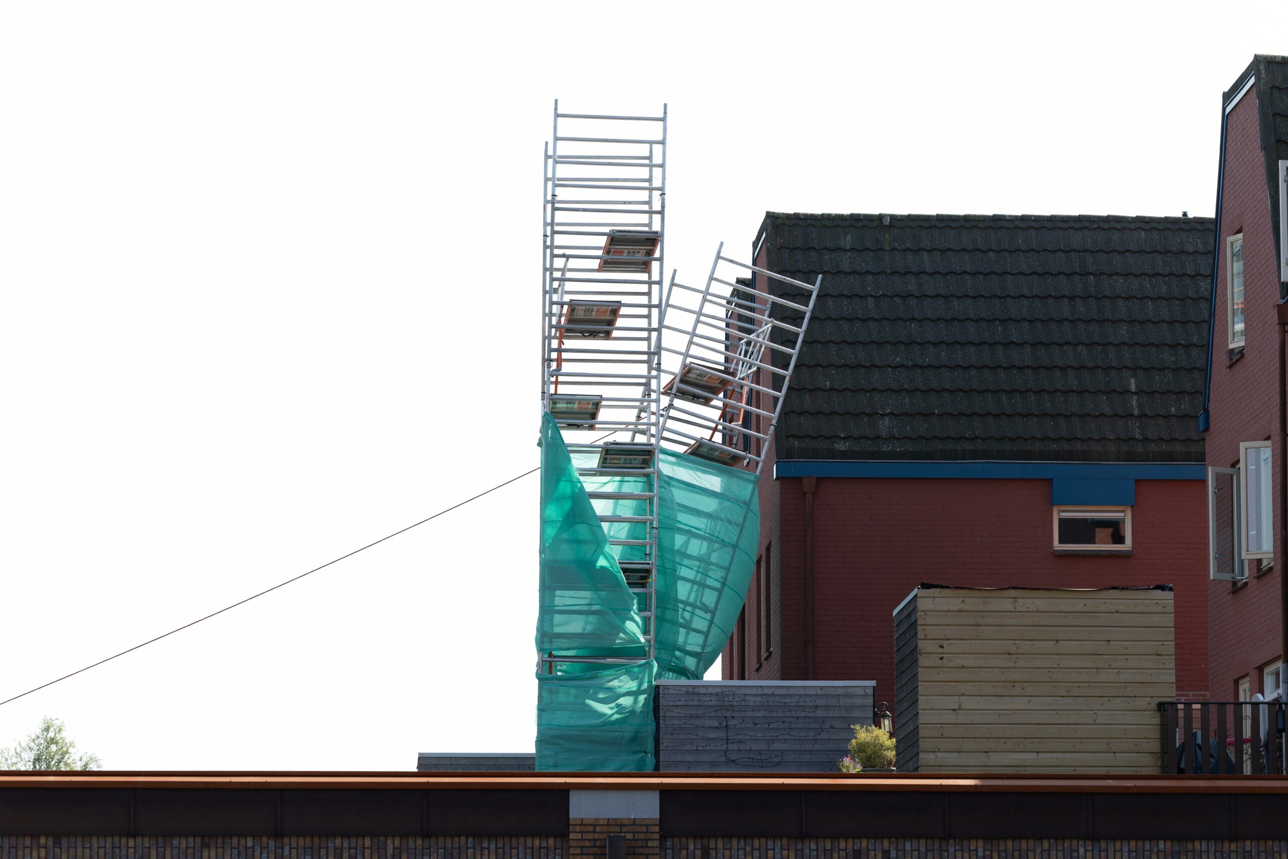 Brandweerlieden zijn het dak opgeklommen. “Zij hebben de steiger rechtop getrokken en vervolgens gezekerd. Daarmee wordt voorkomen dat de steiger opnieuw om kan vallen. De schade is beperkt gebleven.”