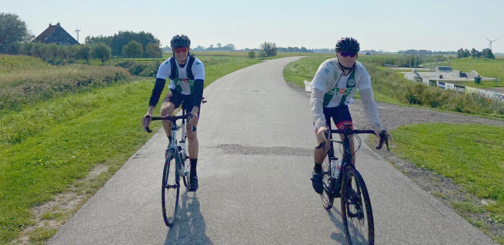De groep studenten wordt onder andere gesponsord door OG Clean Fuels (hoofdsponsor FC Groningen). Beide heren zitten daarom met een groen-wit shirt op de fiets. Toepasselijk, aangezien dit weekend de derby tegen SC Heerenveen op de planning staat: “We halen nu eerst geld op in Friesland en in het weekend nemen we de punten mee naar huis!” zegt Job stellig.