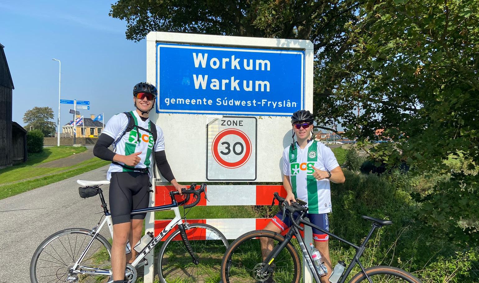 De groep studenten wordt onder andere gesponsord door OG Clean Fuels (hoofdsponsor FC Groningen). Beide heren zitten daarom met een groen-wit shirt op de fiets. Toepasselijk, aangezien dit weekend de derby tegen SC Heerenveen op de planning staat: “We halen nu eerst geld op in Friesland en in het weekend nemen we de punten mee naar huis!” zegt Job stellig.
