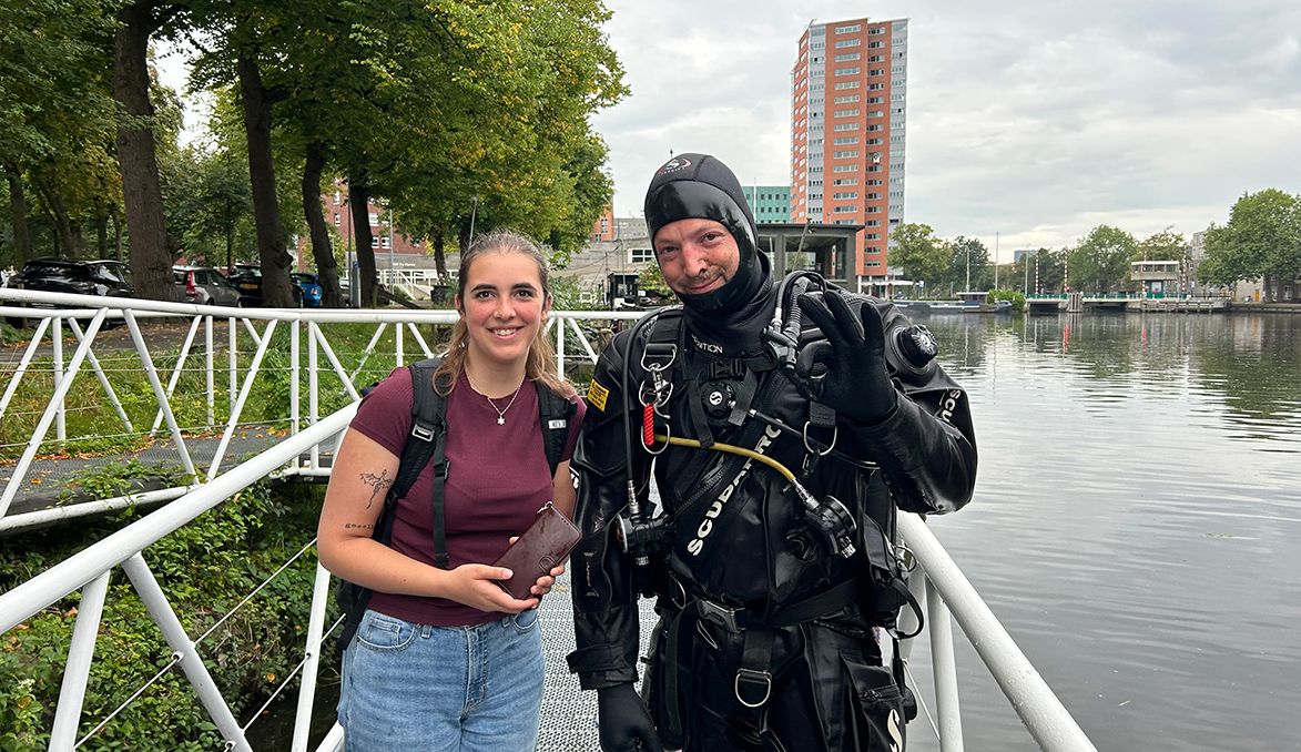Met hulp van de brugwachters van de gemeente duikt één van de duikers van de stichting rond 10.00 uur woensdagochtend het water in bij de Museumbrug, nadat ook het stel is gearriveerd. De duiker windt er geen doekjes om en binnen zes minuten haalt deze enkele blikjes, een vape en zelfs een compleet skateboard naar boven met behulp van een metaaldetector.