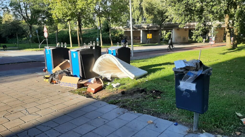 Onder meer op de kruising van de Mispellaan en de Elzenlaan zijn de vuilcontainers bijna niet meer te onderscheiden van de grote berg afval en huisraad die eromheen gedumpt is. Ook aan de Asingastraat lag er ogenschijnlijk meer afval buiten een aantal papier- en glascontainers dan erin.