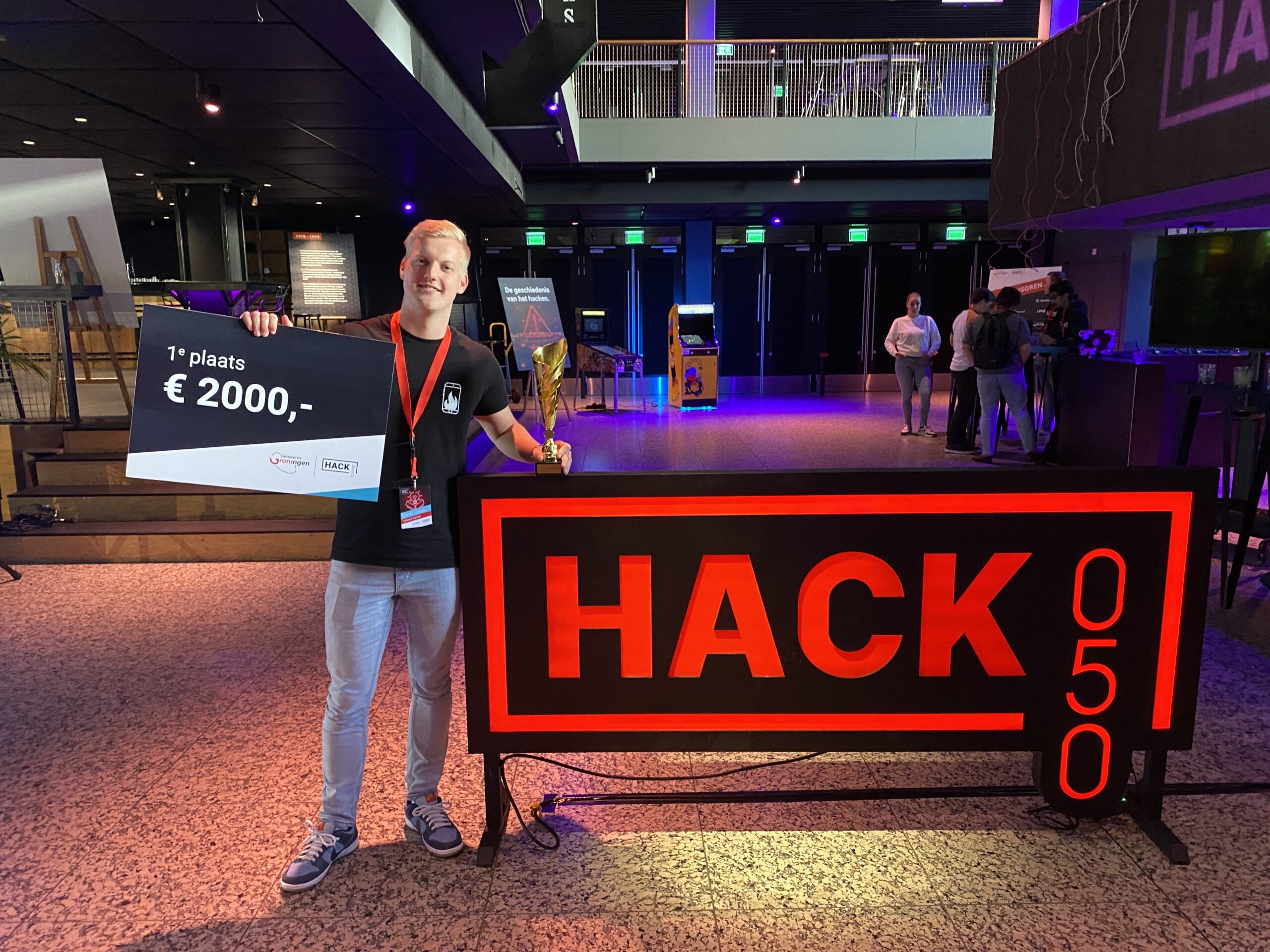 Daniel Wolters heeft tijdens het Hack050-evenement van dinsdag in de Oosterpoort de eerste prijs gewonnen. Hij ontdekte een kwetsbaarheid in een systeem van de gemeente Groningen.