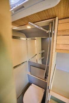 De badkamer bestaat uit een douche en een toilet die naar buiten kan worden geschoven wanneer de camper stilstaat. Hierdoor wordt de binnenruimte van de badkamer vergroot.