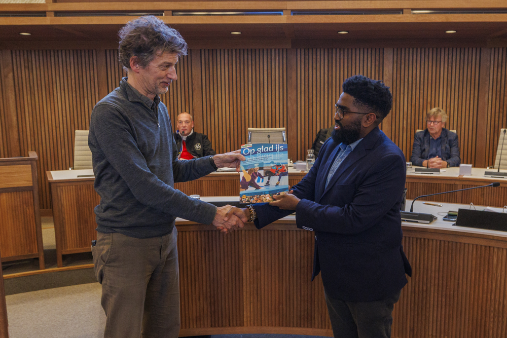 Voor de vergadering was veel belangstelling. Op de publieke tribune hadden zich diverse verenigingen, in clubtenues, verzameld die van het ijs van Kardinge gebruik maken. “Er maken zo’n 120 schaatsverenigingen van het ijs gebruik die aangesloten zijn bij de KNSB”, vertelt Hein Schepers van de stuurgroep. “Samen hebben zij zo’n 3.000 leden, 700 jeugdleden, 600 studentenschaatsers en zijn er vijftien wedstrijdverenigingen.”